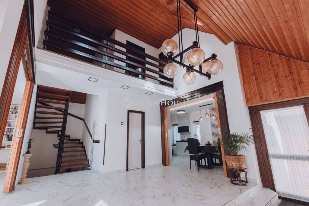\nA házba belépve fényes előszoba fogad minket, amely a konyha közelsége miatt könnyedén nagyobb társaság szórakoztatására is alkalmas étkezővé alakítható. A nappali tágas és fénnyel egész nap bőségesen ellátott, télen a meleget padlófűtés mellett látványkandalló biztosítja hőlégbefúvással. Az emeletre feltekintve galériát pillanthatunk meg, a ház minden szeglete egyediséget sugároz.