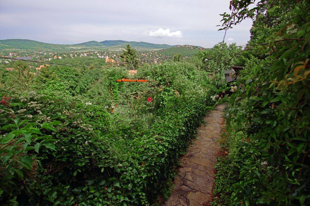 A garázs melletti kapun belépve lépcsőn mehetünk fel a kertbe, ahonnan a 88 m²-es pince/szuterén nyílik (félig a talajszint fölött, félig a föld alatt, ahogyan a hegy emelkedik).