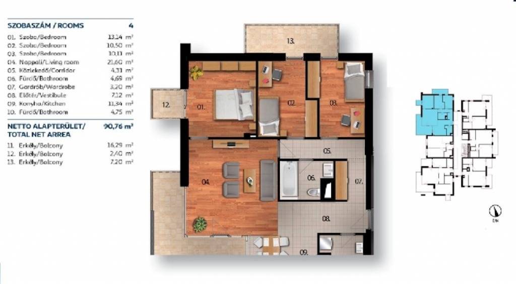 43 négyzetméter alapterületű, 1+1 szobás lakástól a 150 négyzetméteres, 5 szobás és a tetőteraszos, exkluzív penthouseokig.