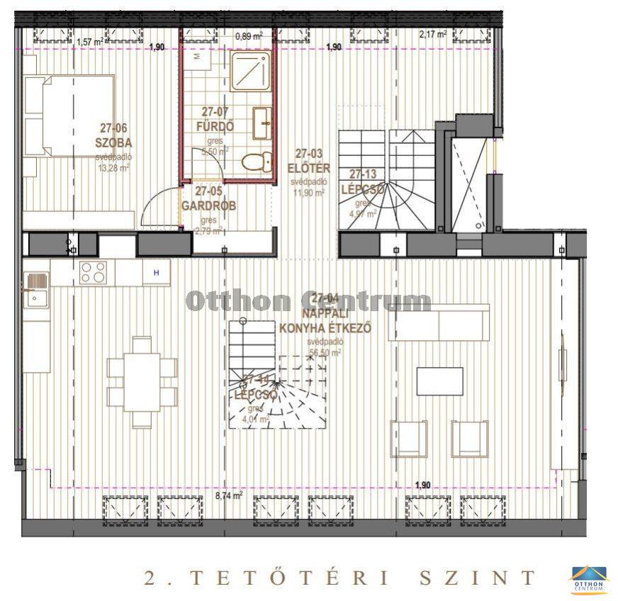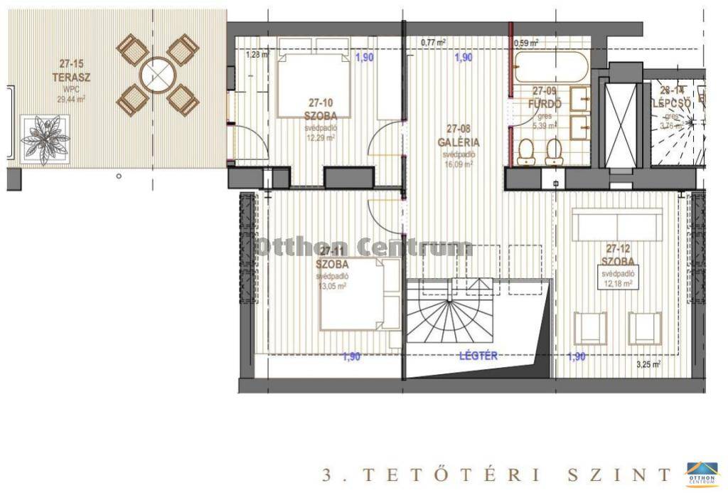 A legnagyobb és a legszebb panorámával rendelkező háromszintes lakás, tetőterasszal belső légteres nappalival. Kedvező beosztású, a bejáraton belépve, a lépcsőn felérkezve az előtérből közvetlenül a nappali és egy hálószobába vezető gardróbszoba nyílik. A gardróbból nyílik a vizesblokk épített zuhanyzóval. A nappaliból felfele vezető lépcsőn a harmadik szintre juthatunk, ahol két különnyíló hálószoba lesz kialakítva. Az emeleten található egy a nappalival egy légtérben lévő pihenő, közösségi helység, illetve egy vizesblokk. A terasz, az egyik hálószobán keresztül közelíthető meg, jacuzzi elhelyezhető rajta.