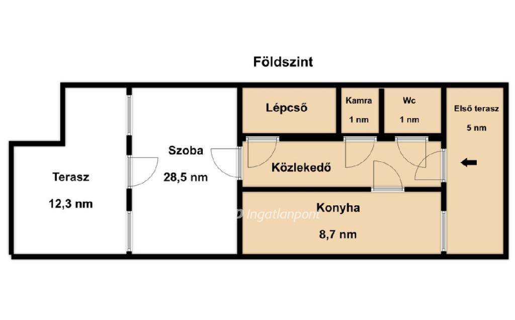 Földszint: kert, terasz, nappali + étkező, kamra, tároló, konyha, Wc, előszoba