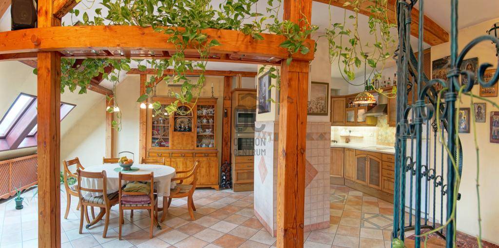 A lakás a társasház legfelső, 6. emeletén található, ahova a lift az 5. emeletig visz. Kelet-nyugati tájolásának köszönhetően a lakás egész nap világos. Az alsó szinten tágas amerikai konyhás nappali, étkező és egy dolgozószoba található, amely könnyedén hálószobává alakítható. Itt kapott helyet egy praktikus kamra és egy pezsgőfürdős sarokkáddal felszerelt fürdőszoba is. Az emeletre kényelmes lépcső vezet, ahol két hálószoba, egy török szaunás zuhanykabinnal felszerelt fürdőszoba, valamint a tetőterasz helyezkedik el. A ferde tetőrészek alatt okosan kialakított tárolóhelyiségek rengeteg extra tárolókapacitást biztosítanak.