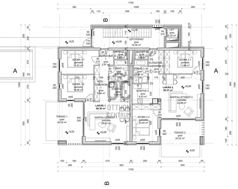 Nettó alapterületük 80nm, 93nm, 64,4nm, 74nm, 87nm, 59nm, 72,5nm penthouse (erkélyek , teraszok alapterületének felével számolva)