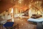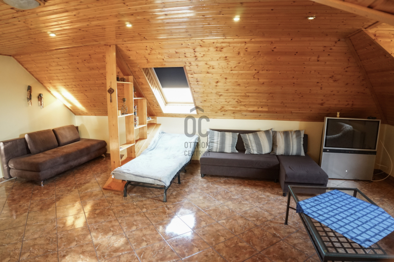 Innen tovább haladva a lépcsőn a tetőtérbe érkezünk, ahol egy tágas, több mint 40 m2 -es nappaliból nyílik három vendégszoba, és a fürdő-wc.