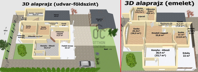 Két, nem átjárható lakórész van kialakítva az épületben, az egyik a földszinten (116 nm + terasz, + garázs), a másik az emeleten (123 nm + erkély)