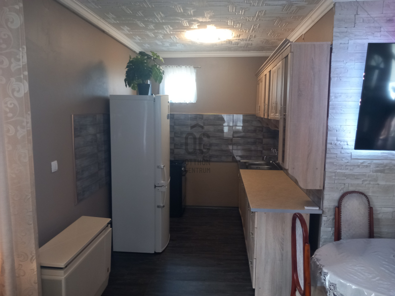 A házba egy 7 nm-es, fedett teraszról juthatunk be. Először a tágas és kellően világos nappaliba lépünk, ahonnan jobbra a két szoba, szembe a fürdőszoba, balra hátul pedig a vele egybenyitott konyha található. Az otthon biztonságáról a már említett kamerarendszer, kellemes hőmérsékletéről pedig a klíma és a gáz-konvektorok gondoskodnak. A födém nemrég lett szigetelve!