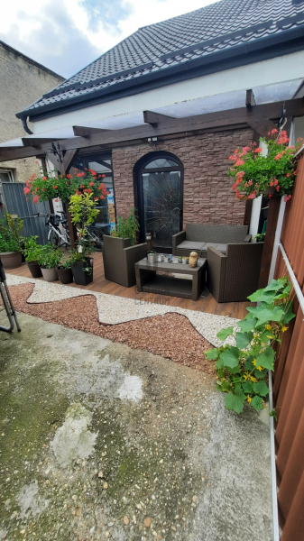 Kialakításra került a zárt udvaron, az előszobához csatlakozva, egy hangulatos fedett terasz, mely jó helyszín a családi, baráti beszélgetéseknek, kikapcsolódásnak.