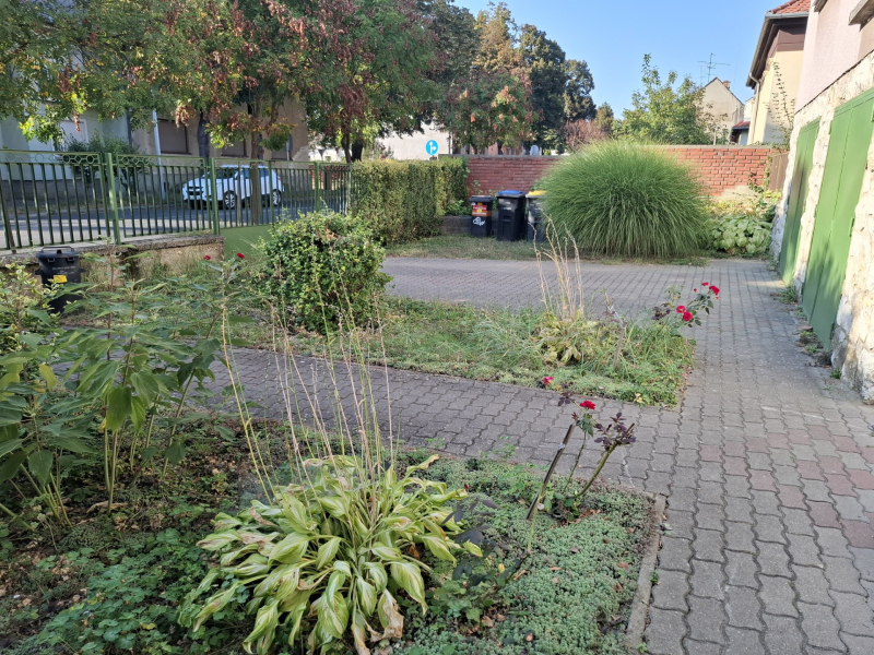 A társasházban 4 lakás található, a ház előtt zárt udvarban virágoskert, hátul az udvarban konyhakert, vagy pihenésre alkalmas sarok kialakítható.