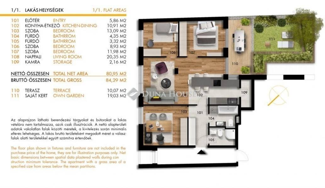 Ez a lakás az 1. emeleten helyezkedik el, nappali + 3 hálós, 2 fürdős kialakítással, a lakáshoz tartozik egy 10,13 nm-es fedett terasz és egy 18, 23 nm-es saját kert is.