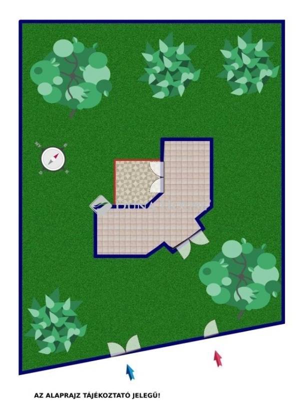Földszinten nappali, 45 nm -es félig fedett terasszal a kert felé, külön konyha és étkező, 1 hálószoba, kamra, fürdő, wc-vel.