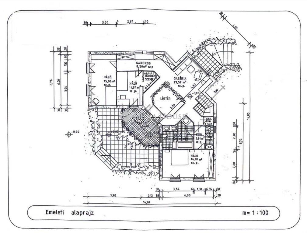 A felső emeleten nyitott, 28 nm -es közösségi helyiség, 15 nm-es terasszal, 3 külön nyíló hálószoba, fürdő és wc található.