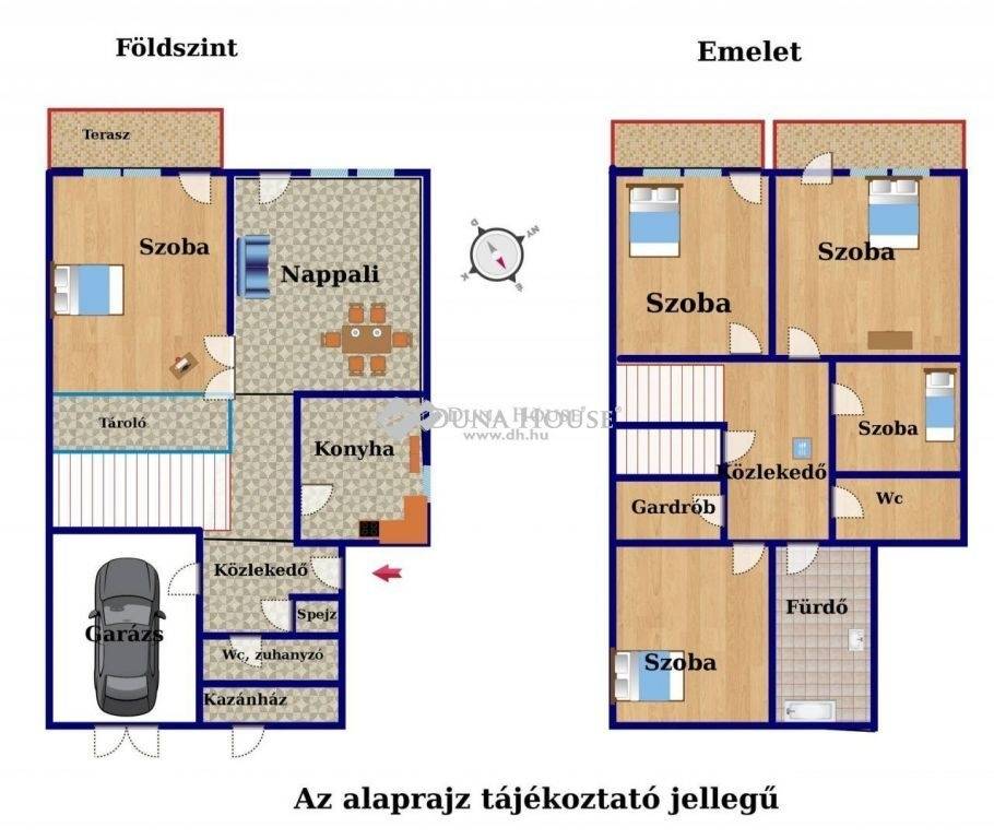 Kialakítása: 4 hálószoba, nappali, terasz, konyha, 2 fürdőszoba, 2 wc, kamra, garázs, kazánház, erkély + tetőtér ( Elkezdődött a beépítés, de nem került sor a befejezésre. )