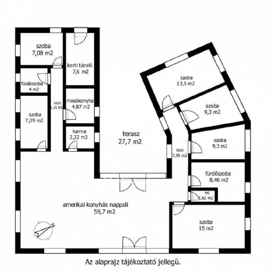 Elrendezése: tágas amerikai konyhás nappali, öt szoba, két fürdőszoba, külön wc, kamra és egy kerti tároló található benne.