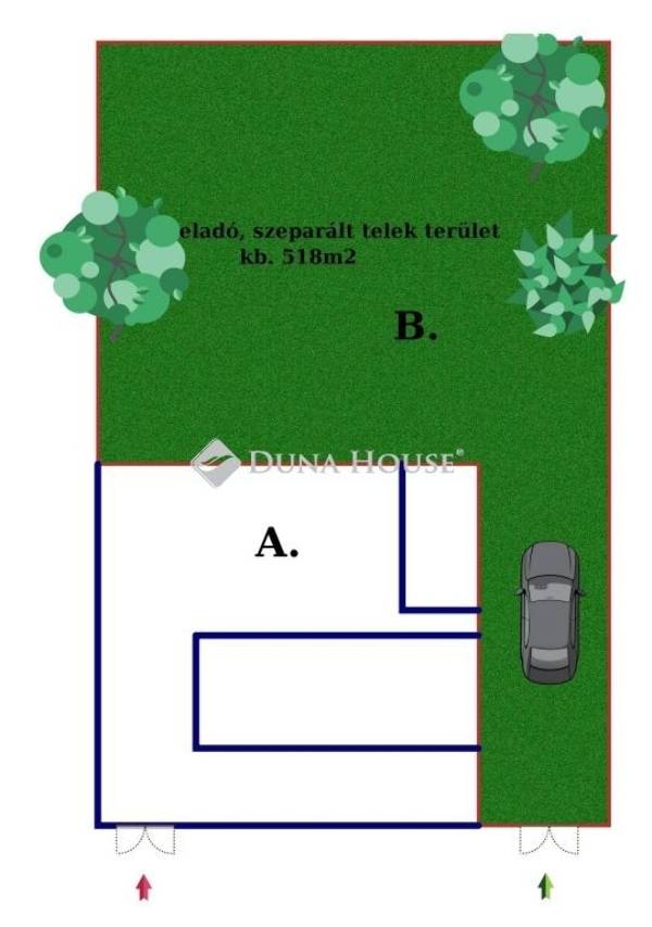A családi ház az eredetileg 1063m2 telek elülső részén helyezkedik el, így lehetőség van a hátsó, jelen helyzetben nem hasznosított telekrész eladására, amely nagyságrendileg 518m2 méretű, kb.19m széles terület.
