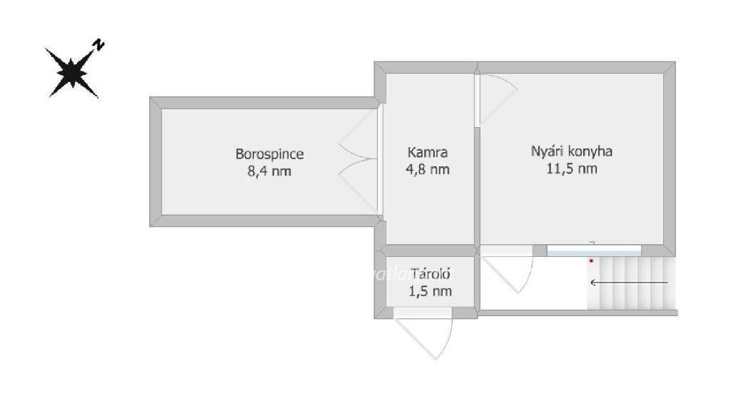 A szuterén rész az udvarról nyílik, néhány lépcsőn lesétálva. Itt található a nyári konyha, egy kamra és a borospince. Az épület másik sarkánál, néhány falépcsőn jutunk a földszinti teraszra, ahonnan a közlekedőn át léphetünk a nappaliba, innen léphetünk a kis hangulatos konyhába és a fürdőszobába. A nappaliban található a fatüzelésű kályha, mellyel az egész földszint könnyedén befűthető, így akár egész évben élvezheti a Balatoni életet.
