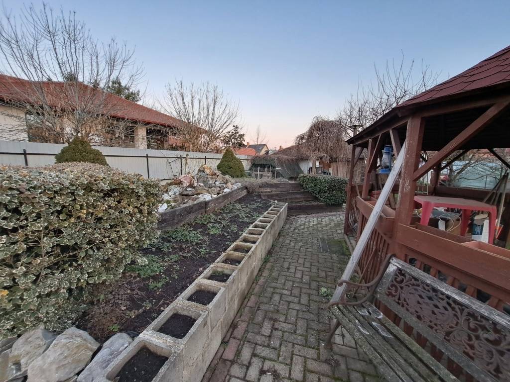 A telek területe 2100 m2, ahol a kocsibeálló végig térkövezett és helyet kapott egy kemence, nagyobb terasz és a kert hátsó részén robotfűnyírók által karbantartott parkosított pihenőkert halastóval.