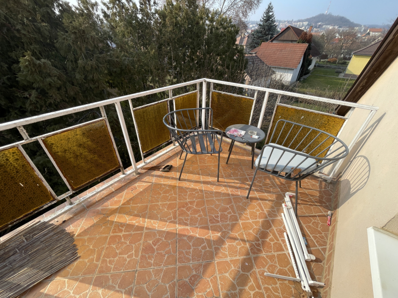 Tartozik a házhoz az alsó szinten fedett terasz, a tetőtérben pedig a legnagyobb helyiségből szintén nyílik egy terasz. A fedett terasz mellől jutunk le a szuterénbe, ahol a gázkazán és tároló helyiségek találhatók. Az udvar végén egy gazdasági épületként nyilvántartott 2 beállós garázs és tároló helyiségek vannak. Az udvar nagy része füvesített, gyümölcsfákkal, az utcafront felől tujákkal elszeparálva. A garázsig zúzott köves út vezet.