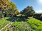 A kerítéssel körbe kerített telek füvesített, termő gyümölcsfákkal, szőlővel beültetett.