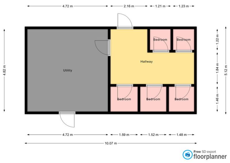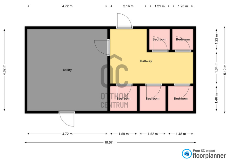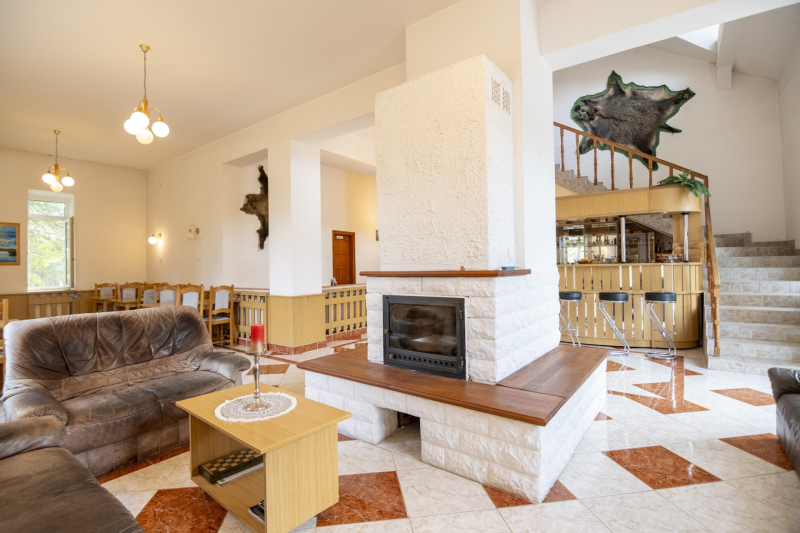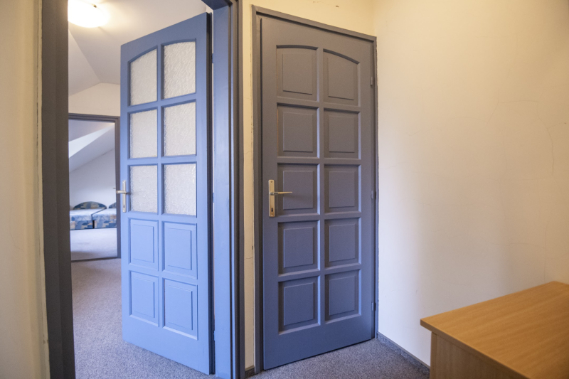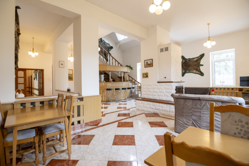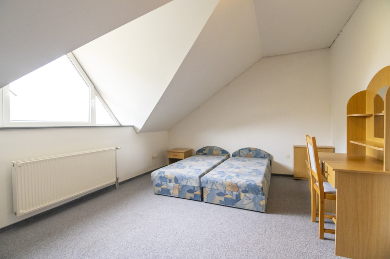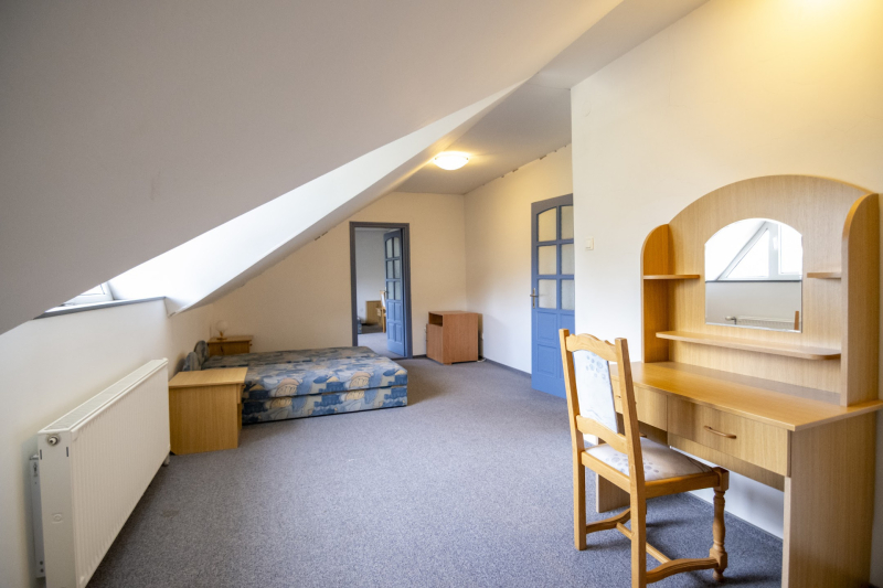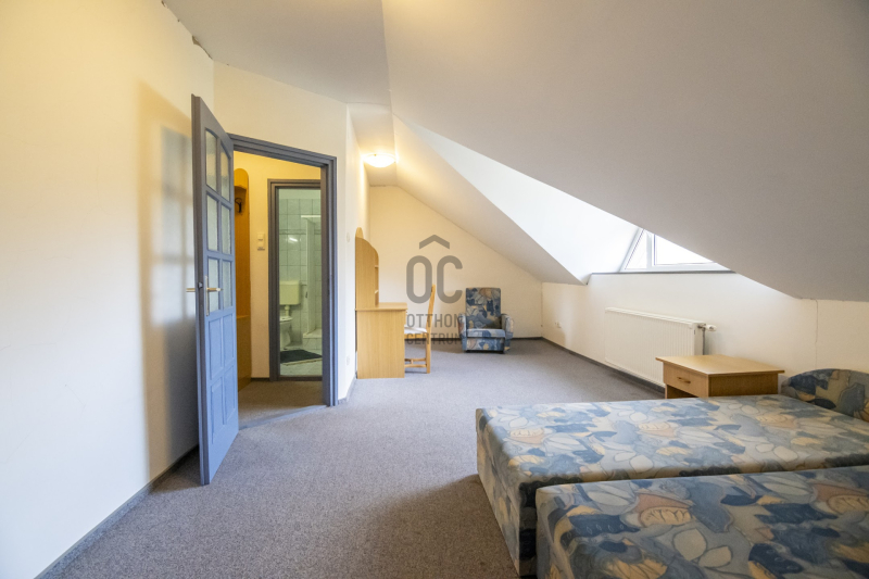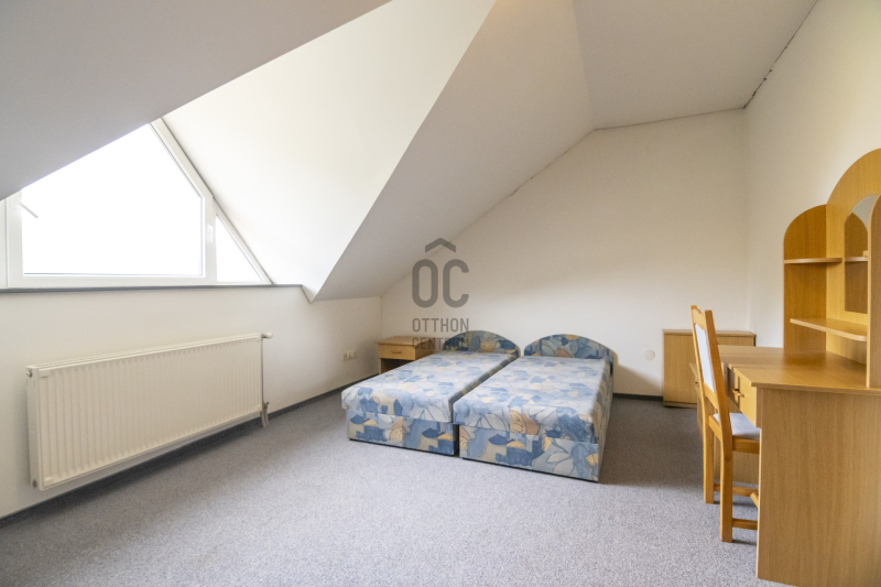 A földszinten 4 szoba található nagy közös térrel, az emeleten 9 szoba önálló fürdőszobákkal