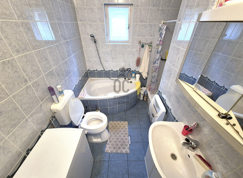 •Tágas fürdőszoba sarokkáddal, zuhanyzóval és WC-vel