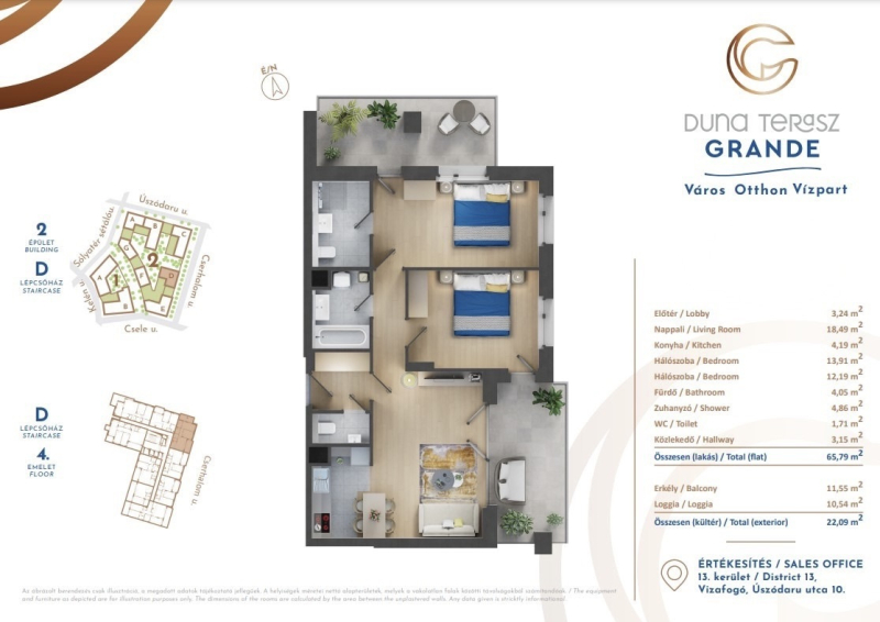 XIII. Marina Parton, a 2024-ben átadott Duna Terasz Grande 4.emeletén, duplakomfortos, 66 m² alapterületű + 2 db terasszal rendelkező (22 m²) , emelt szintű burkolatokkal ellátott háromszobás otthon eladó.
