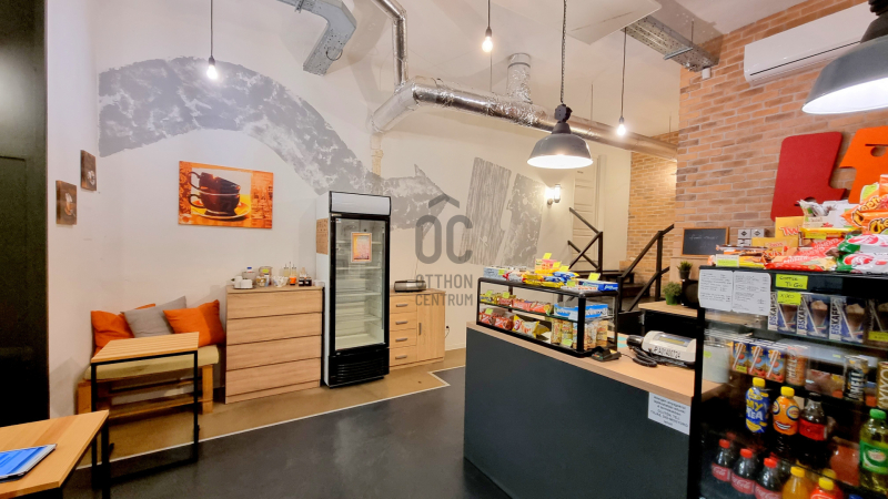 A bejárattól egy kényelmes lépcső vezet a közösségi térbe ahol recepció mellett felszerelt, jelenleg is működő büfé és kávézó fogadja az érkezőket.