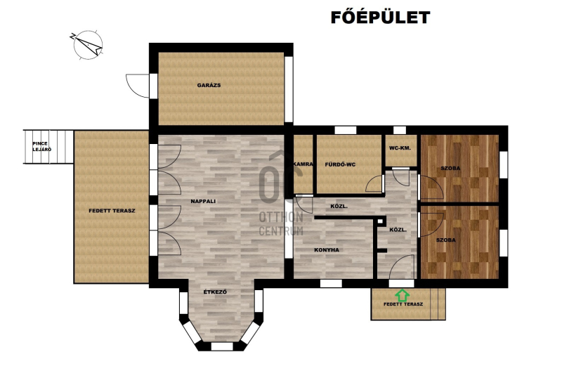 Nagy fedett terasz, 2 szoba, konyha-étkező, fürdőszoba épült egyidőben a főépülettel.