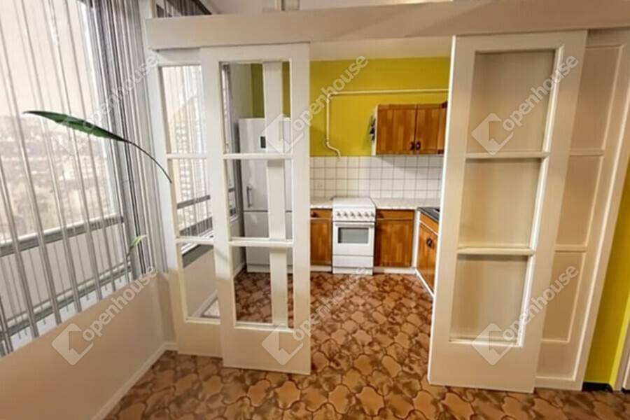 - A lakásban található egy konyha és étkező, melyek üvegezett tolóajtóval vannak elválasztva.