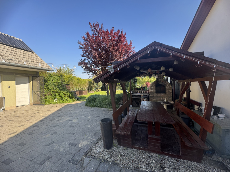A 25 négyzetméteres terasz,kerti kiülő,grillező és kemence tökéletes helyszínt biztosít a családi összejövetelekhez vagy a pihenéshez, míg a rendezett kert igazi zöld oázist teremt a mindennapokban,öntözése fúrt kútról megoldható.