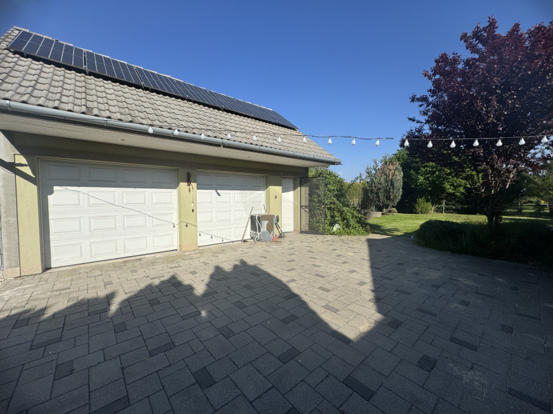 Megtalálható a telken egy dupla garázs, mely fűthető is.