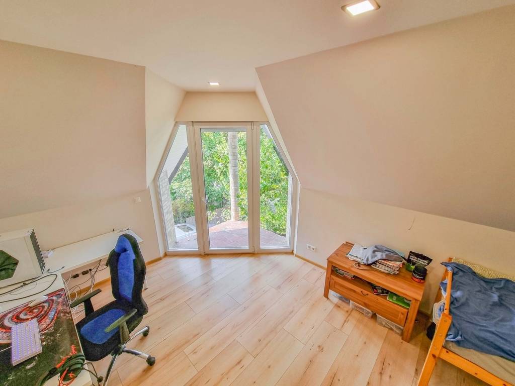 Az emeleti szobából teraszajtón át külön ki/bejárás lehetséges a kertbe