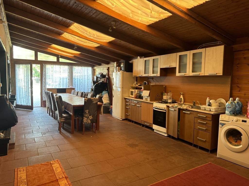 A házhoz egy fedett zárt könnyűszerkezetes hatalmas nagy nappali konyhával hozzáépítésre került, így itt kényelmesen lehet pihenni, összejöveteleket tartani.