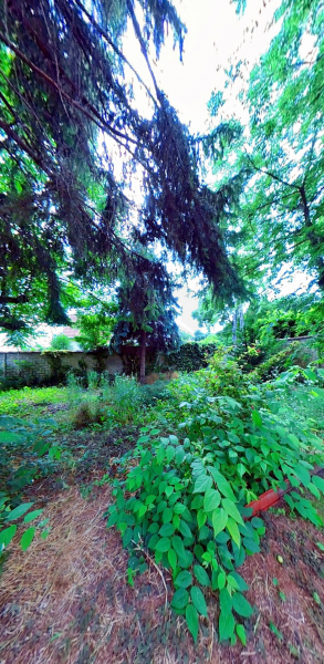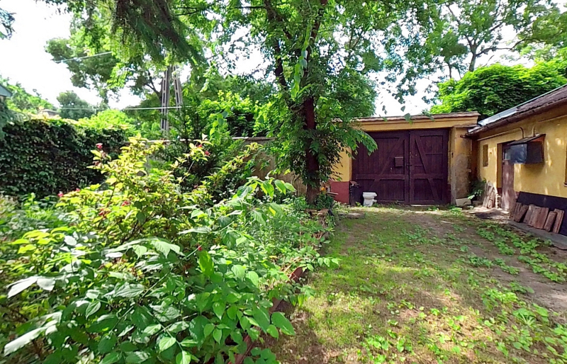 Fákkal, diófával, tusolóval, kerti csappal ellátott.