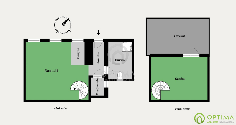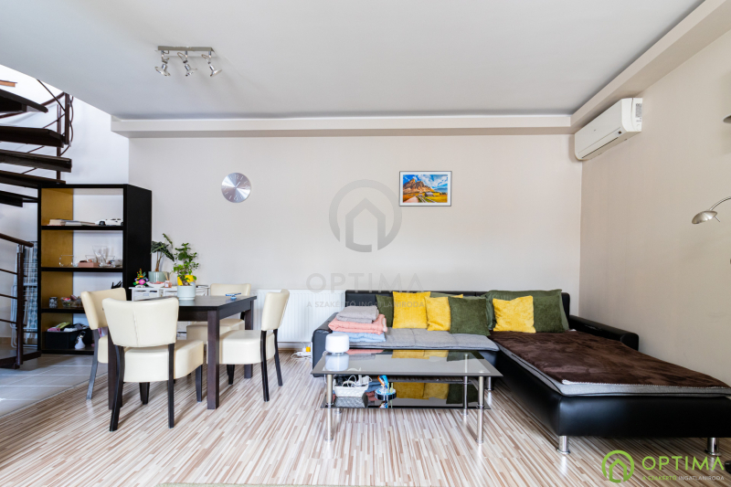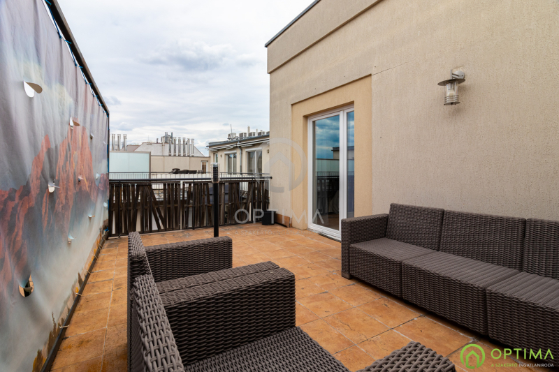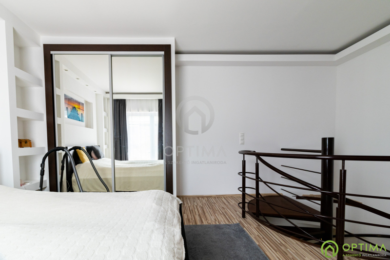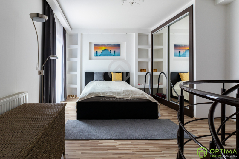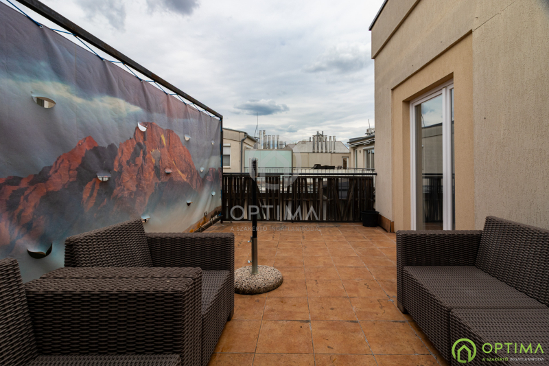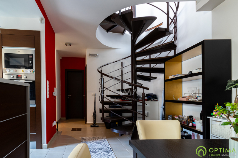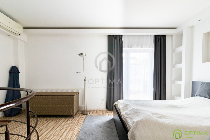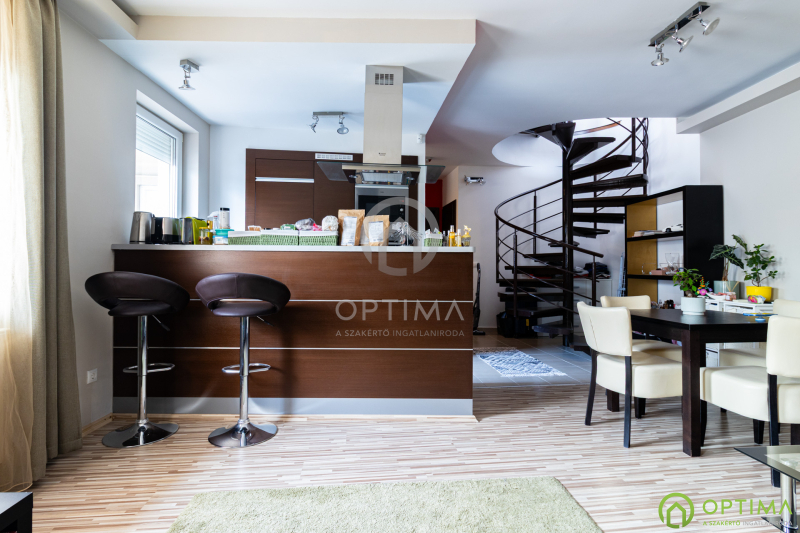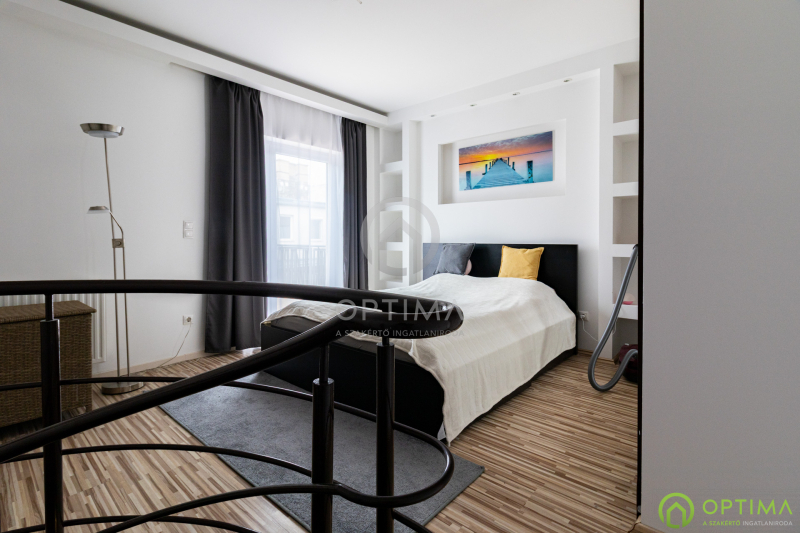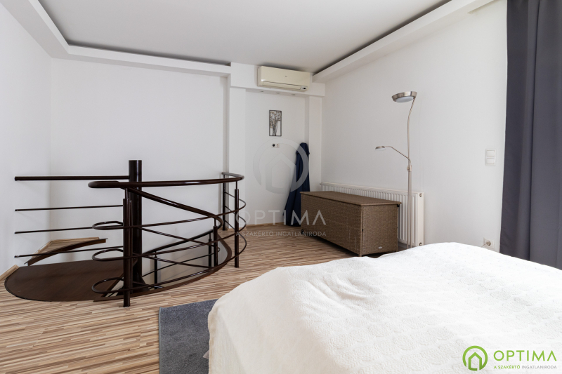 A lakás belső kétszintes, az alsó szinten található egy kifejezetten tágas amerikai konyhás nappali, egy fürdőszoba és egy külön mosókonyha. A felső szinten található a háló, melyből nyílik egy 16 m2-s terasz is, mely igazi RITKASÁG a belvárosban. :)