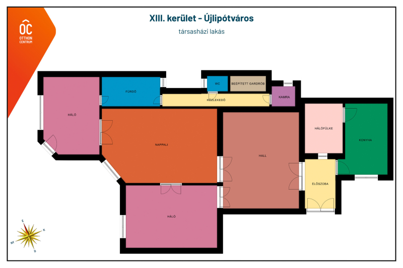 -Tágas előszoba, konyha-étkező, nappali, hall, két hálószoba és egy hálófülke
