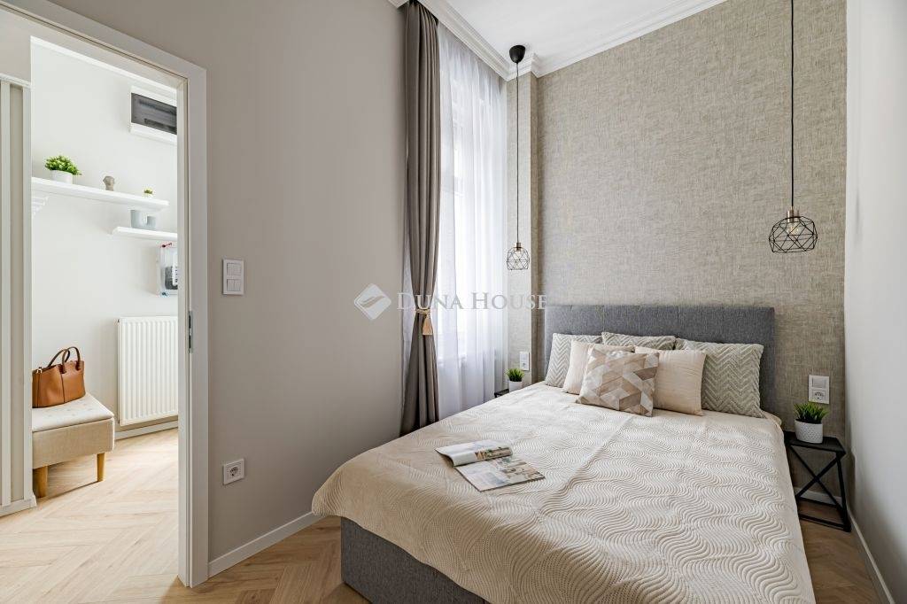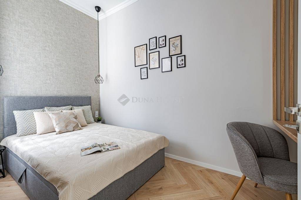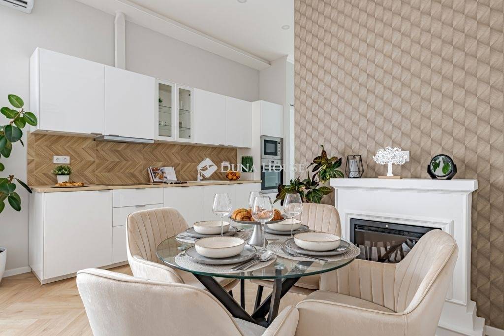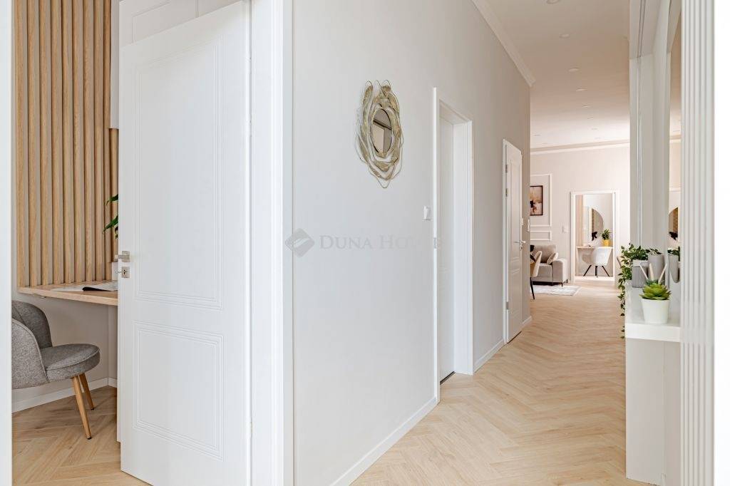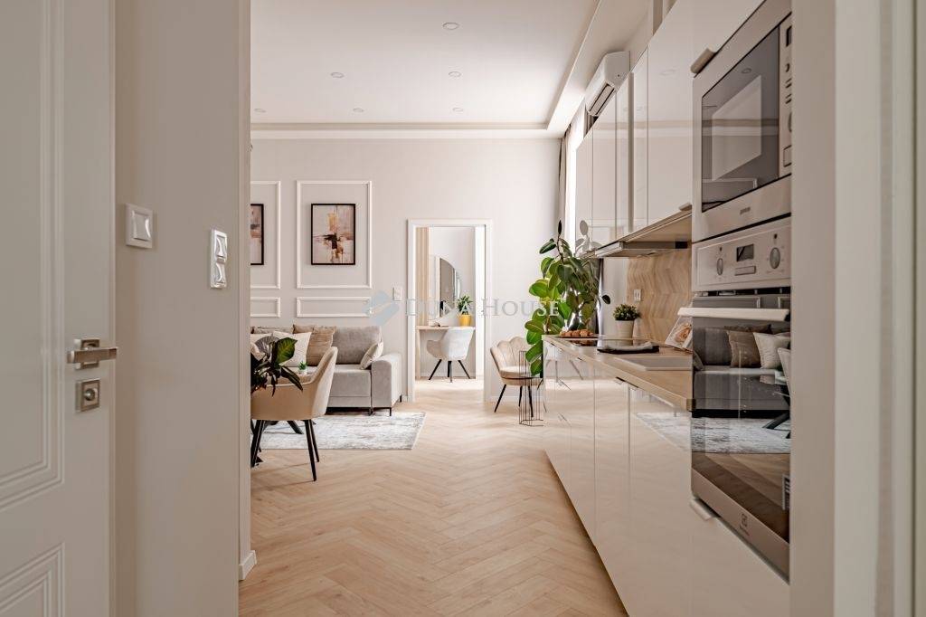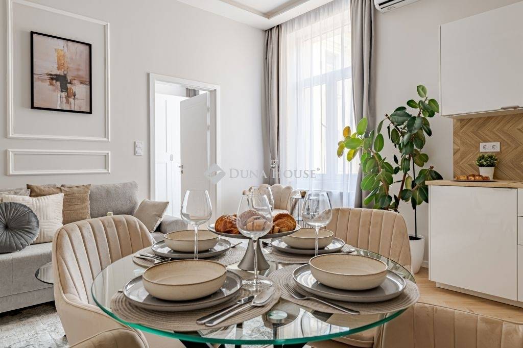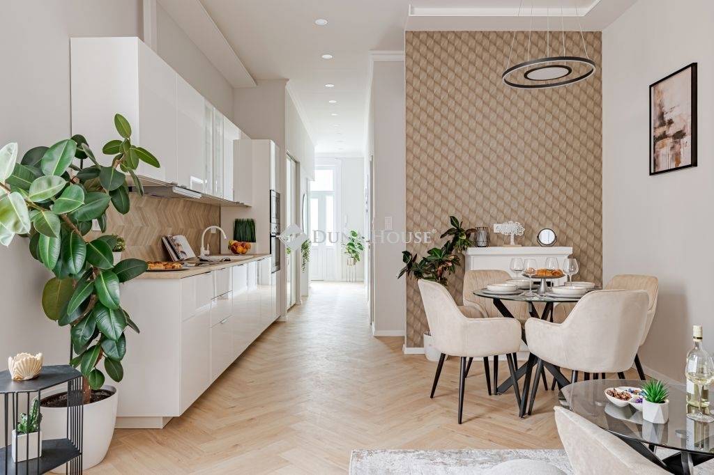Prémium lakás Budapest szívében Eladásra kínálunk egy 60 m²-es, nappali + 2 hálószobás lakást az V. kerület egyik legkedveltebb utcájában, liftes ház 3. emeletén. A teljes körű, prémium minőségű felújítás 2025 június végére készül el.A lakás a folyosó végén található, így csendes, privát, a bejárat mellett saját teraszrész is kialakításra kerül. Átgondolt elrendezés, két különnyíló háló, modern fürdő, külön WC, gépesített konyha és világos terek jellemzik.Házközponti fűtés, új villanybojler, hő- és hangszigetelt ablakok redőnnyel, klíma a nappaliban. A társasház kívülről rendezett, a belső terek felújítása folyamatban, hamarosan befejezésre kerül.Pár perc sétára metró, Erzsébet tér, éttermek, üzletek – ideális választás otthonnak vagy befektetésnek is.