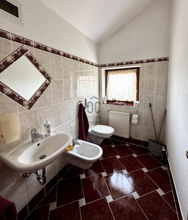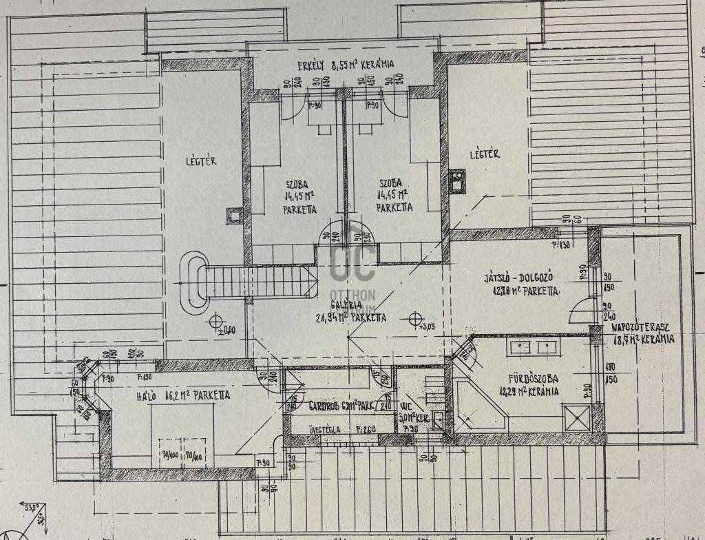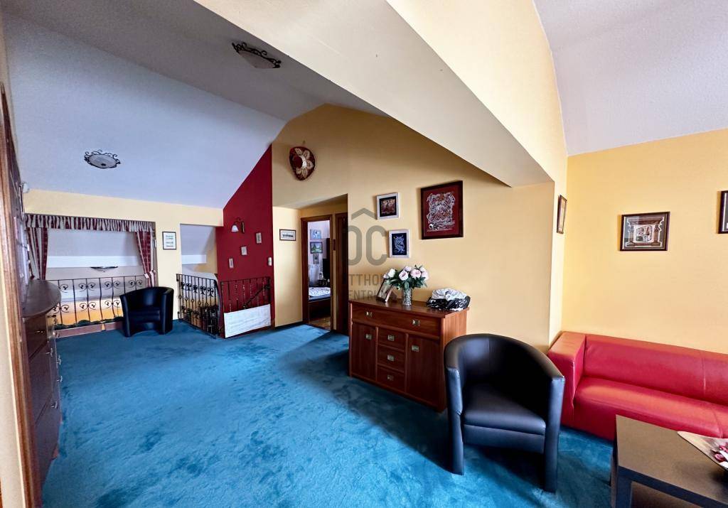 A nagyobbik lakás: az épület földszintjén található a nappali- étkező konyha, kamra, mosdó-kézmosó helyiségek, és ehhez tartozik az emeleten található 3 db tágas méretű különnyíló hálószoba, fürdő, külön WC, dolgozó.
