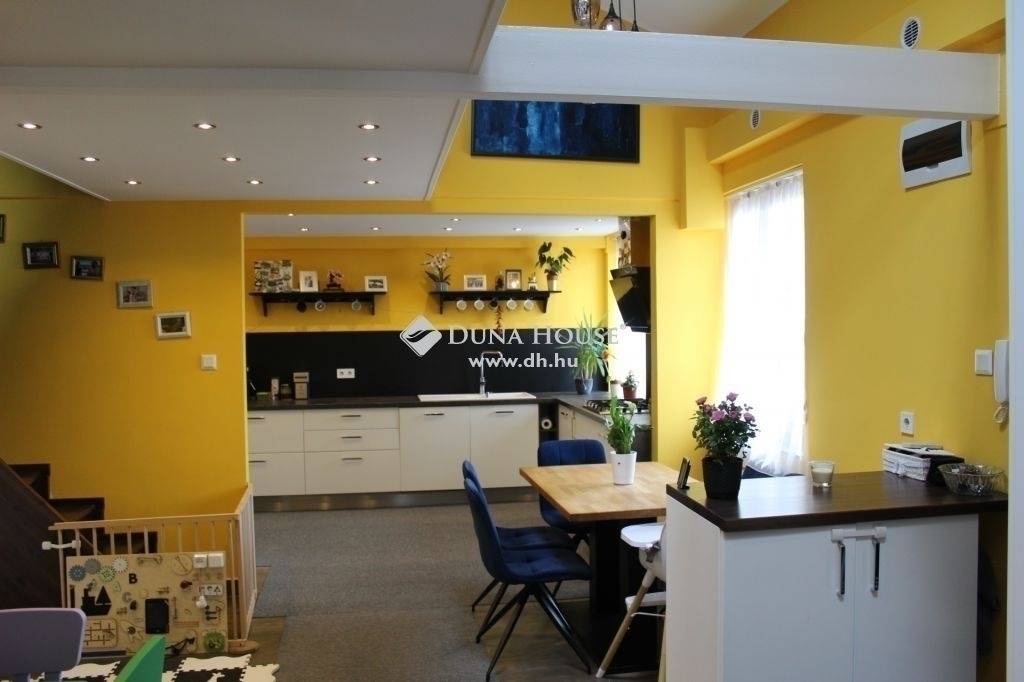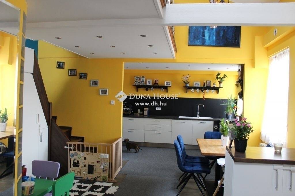 Különleges belső kétszintes lakás eladó a II. János Pál pápa téren!Eladásra kínálunk egy igazán egyedi hangulatú, 98 nm-es, belső kétszintes lakást Budapest 8. kerületének közkedvelt részén, a II. János Pál pápa téren, kiváló infrastruktúrával és tömegközlekedéssel.A lakás földszintjén egy tágas, világos nappali, egy nagy étkező és egy különleges, 24 nm-es modern konyha kapott helyet. A konyha teljesen felszerelt, gépesített, beépített szekrénysorral, amelyben minden konyhai eszköz, sőt a hűtő is rejtve van, így az elegáns megjelenés garantált.A földszinten található továbbá egy külön szoba, amely akár második nappaliként vagy vendégszobaként is funkcionálhat, valamint egy különleges kialakítású fürdőszoba, melyet félköríves, üvegtéglás fal határol. Ez nemcsak esztétikus, de lehetővé teszi a természetes fény beáramlását, miközben megőrzi a privát szférát – a lakás igazi ékköve!Az emeletre felérve a tetőtér beépített részén egy 24 nm-es nappaliba érkezünk, amit jelenleg két funkcionális térre – hálószobára és dolgozószobára – osztottak, de igény szerint könnyedén visszaalakítható egy légtérré. Ezen a szinten egy külön szoba is található, amely hálószobaként vagy gyerekszobaként is kiválóan használható.A lakás állapota kifogástalan: frissen festett, folyamatosan karbantartott, így az új tulajdonos azonnal költözhet. A praktikumot tovább növeli a lépcső alatti beépített szekrény, valamint a földszinti szobában található gardrób, amelyek sok extra tárolóhelyet biztosítanak.Ez a lakás egyedi kialakításának, nagy alapterületének és praktikus elrendezésének köszönhetően tökéletes választás akár családoknak, akár otthoni irodát keresőknek.Ne maradjon le róla, jöjjön el, és nézze meg személyesen!