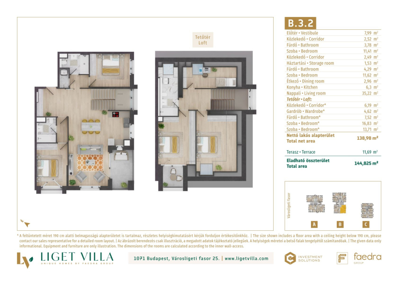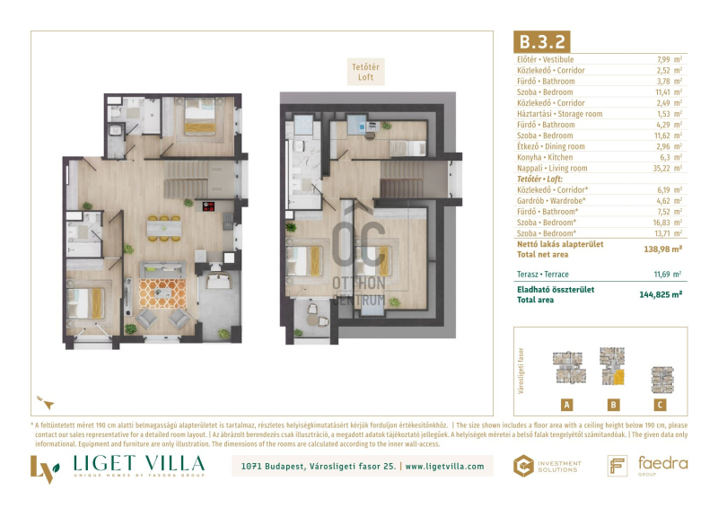 A pesti diplomatanegyed legszebb utcájában épül, a megjelenésében, műszaki tartalmában és a lakáskínálata tekintetében egyaránt unikális, Liget Villa Lakópark. Az épületbe érve, egy elegáns lobby és recepcióra érkezünk majd. Innen a három épületet egy kerti úton, passzázs köti majd össze. A tervezés során nagy hangsúlyt kapott a családi igényekre tervezett lakás minőségi használhatósága. Ablakos konyhák, master bedroom-ok, dupla fürdőszobák, gardrób és háztartási helyiségek is helyet kapnak a lakásban. Kiemelten jól bútorzható, két irányba tájolt lakások kerülnek kialakításra. A földszinti lakásokhoz 50-100 m2-es privát kertek, míg a közös területeken tájépítész által tervezett reprezentatív kertet alakítunk ki. A lakásokban mennyezeti hűtés-fűtés biztosítja a téli-nyári kellemes komfortérzetet. A nyílászárók 3 rétegű üveggel, alu-fa kivitelben kerülnek beépítésre. A lakások ára tartalmazza alapárban az alu elektromos redőnyöket és okosotthon kiépítést is. Magas minőségű olasz és spanyol hidegburkolatválasztékban akár 60x60 cm-es lapok is válaszhatóak majd. A fa parketta és az átlag feletti minőség szaniterek, szintén alapárban válaszhatóak a lakásokba. Az épületek alatti mélygarázsban gépkocsibeállók és tárolók kerülnek kialakításra.