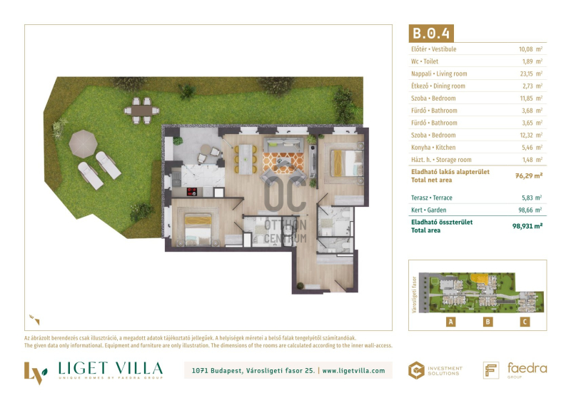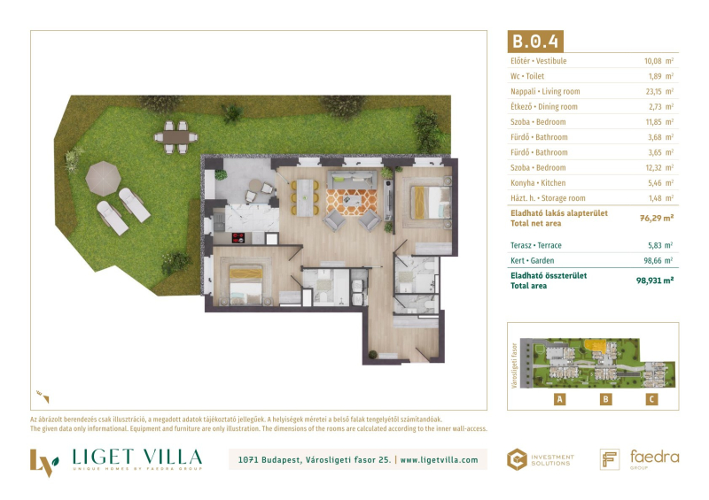 A pesti diplomatanegyed legszebb utcájában épül, a megjelenésében, műszaki tartalmában és a lakáskínálata tekintetében egyaránt unikális, Liget Villa Lakópark. Az épületbe érve, egy elegáns lobby és recepcióra érkezünk majd. Innen a három épületet egy kerti úton, passzázs köti majd össze. A tervezés során nagy hangsúlyt kapott a családi igényekre tervezett lakás minőségi használhatósága. Ablakos konyhák, master bedroom-ok, dupla fürdőszobák, gardrób és háztartási helyiségek is helyet kapnak a lakásban. Kiemelten jól bútorzható, két irányba tájolt lakások kerülnek kialakításra. A földszinti lakásokhoz 50-100 m2-es privát kertek, míg a közös területeken tájépítész által tervezett reprezentatív kertet alakítunk ki. A lakásokban mennyezeti hűtés-fűtés biztosítja a téli-nyári kellemes komfortérzetet. A nyílászárók 3 rétegű üveggel, alu-fa kivitelben kerülnek beépítésre. A lakások ára tartalmazza alapárban az alu elektromos redőnyöket és okosotthon kiépítést is. Magas minőségű olasz és spanyol hidegburkolatválasztékban akár 60x60 cm-es lapok is válaszhatóak majd. A fa parketta és az átlag feletti minőség szaniterek, szintén alapárban válaszhatóak a lakásokba. Az épületek alatti mélygarázsban gépkocsibeállók és tárolók kerülnek kialakításra.
