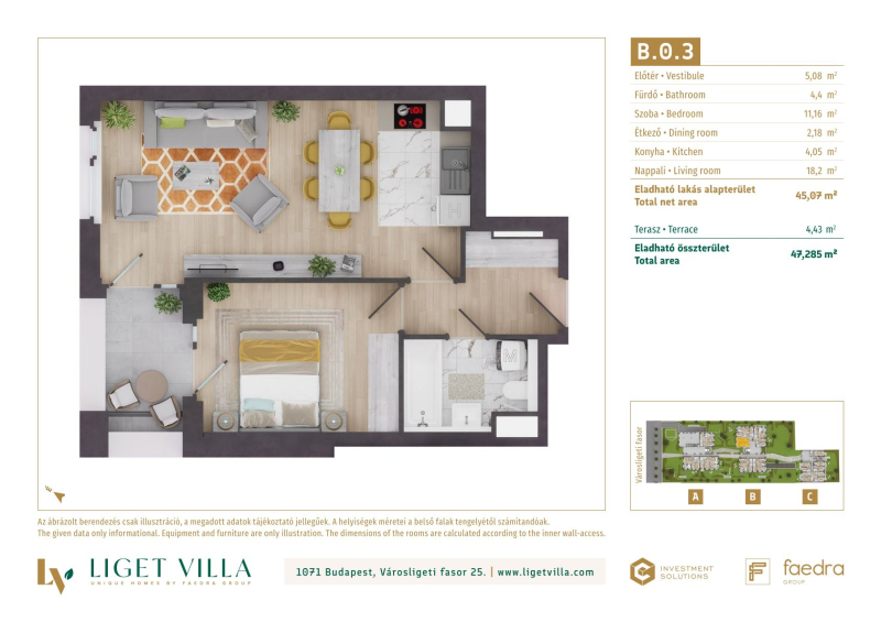 A pesti diplomatanegyed legszebb utcájában épül, a megjelenésében, műszaki tartalmában és a lakáskínálata tekintetében egyaránt unikális, Liget Villa Lakópark. Az épületbe érve, egy elegáns lobby és recepcióra érkezünk majd. Innen a három épületet egy kerti úton, passzázs köti majd össze. A tervezés során nagy hangsúlyt kapott a családi igényekre tervezett lakás minőségi használhatósága. Ablakos konyhák, master bedroom-ok, dupla fürdőszobák, gardrób és háztartási helyiségek is helyet kapnak a lakásban. Kiemelten jól bútorzható, két irányba tájolt lakások kerülnek kialakításra. A földszinti lakásokhoz 50-100 m2-es privát kertek, míg a közös területeken tájépítész által tervezett reprezentatív kertet alakítunk ki. A lakásokban mennyezeti hűtés-fűtés biztosítja a téli-nyári kellemes komfortérzetet. A nyílászárók 3 rétegű üveggel, alu-fa kivitelben kerülnek beépítésre. A lakások ára tartalmazza alapárban az alu elektromos redőnyöket és okosotthon kiépítést is. Magas minőségű olasz és spanyol hidegburkolatválasztékban akár 60x60 cm-es lapok is válaszhatóak majd. A fa parketta és az átlag feletti minőség szaniterek, szintén alapárban válaszhatóak a lakásokba. Az épületek alatti mélygarázsban gépkocsibeállók és tárolók kerülnek kialakításra.