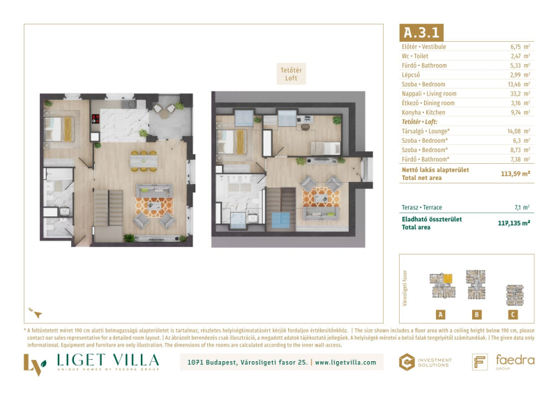 A pesti diplomatanegyed legszebb utcájában épül, a megjelenésében, műszaki tartalmában és a lakáskínálata tekintetében egyaránt unikális, Liget Villa Lakópark. Az épületbe érve, egy elegáns lobby és recepcióra érkezünk majd. Innen a három épületet egy kerti úton, passzázs köti majd össze. A tervezés során nagy hangsúlyt kapott a családi igényekre tervezett lakás minőségi használhatósága. Ablakos konyhák, master bedroom-ok, dupla fürdőszobák, gardrób és háztartási helyiségek is helyet kapnak a lakásban. Kiemelten jól bútorzható, két irányba tájolt lakások kerülnek kialakításra. A földszinti lakásokhoz 50-100 m2-es privát kertek, míg a közös területeken tájépítész által tervezett reprezentatív kertet alakítunk ki. A lakásokban mennyezeti hűtés-fűtés biztosítja a téli-nyári kellemes komfortérzetet. A nyílászárók 3 rétegű üveggel, alu-fa kivitelben kerülnek beépítésre. A lakások ára tartalmazza alapárban az alu elektromos redőnyöket és okosotthon kiépítést is. Magas minőségű olasz és spanyol hidegburkolatválasztékban akár 60x60 cm-es lapok is válaszhatóak majd. A fa parketta és az átlag feletti minőség szaniterek, szintén alapárban válaszhatóak a lakásokba. Az épületek alatti mélygarázsban gépkocsibeállók és tárolók kerülnek kialakításra.