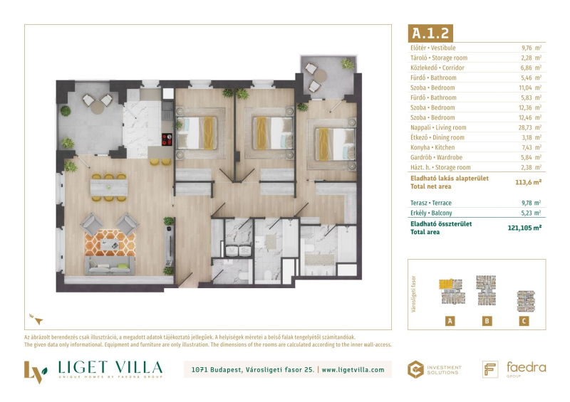 A pesti diplomatanegyed legszebb utcájában épül, a megjelenésében, műszaki tartalmában és a lakáskínálata tekintetében egyaránt unikális, Liget Villa Lakópark. Az épületbe érve, egy elegáns lobby és recepcióra érkezünk majd. Innen a három épületet egy kerti úton, passzázs köti majd össze. A tervezés során nagy hangsúlyt kapott a családi igényekre tervezett lakás minőségi használhatósága. Ablakos konyhák, master bedroom-ok, dupla fürdőszobák, gardrób és háztartási helyiségek is helyet kapnak a lakásban. Kiemelten jól bútorzható, két irányba tájolt lakások kerülnek kialakításra. A földszinti lakásokhoz 50-100 m2-es privát kertek, míg a közös területeken tájépítész által tervezett reprezentatív kertet alakítunk ki. A lakásokban mennyezeti hűtés-fűtés biztosítja a téli-nyári kellemes komfortérzetet. A nyílászárók 3 rétegű üveggel, alu-fa kivitelben kerülnek beépítésre. A lakások ára tartalmazza alapárban az alu elektromos redőnyöket és okosotthon kiépítést is. Magas minőségű olasz és spanyol hidegburkolatválasztékban akár 60x60 cm-es lapok is válaszhatóak majd. A fa parketta és az átlag feletti minőség szaniterek, szintén alapárban válaszhatóak a lakásokba. Az épületek alatti mélygarázsban gépkocsibeállók és tárolók kerülnek kialakításra.