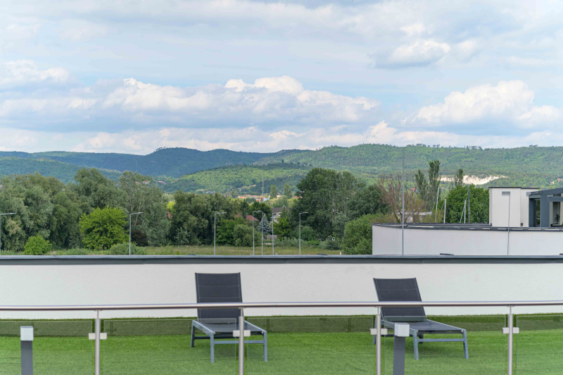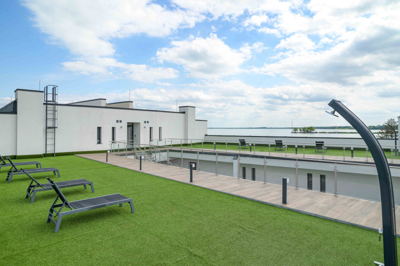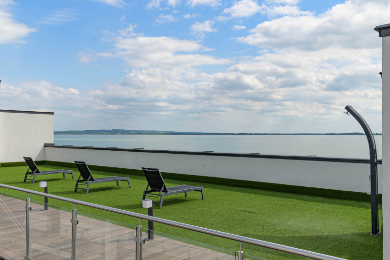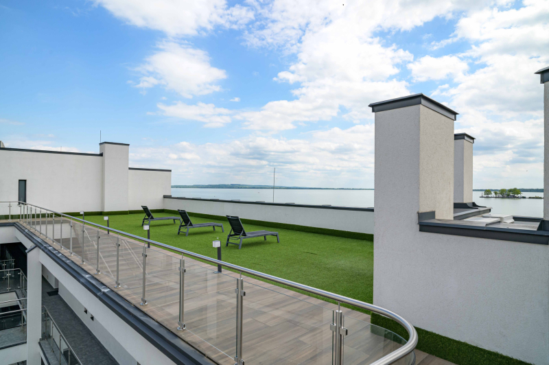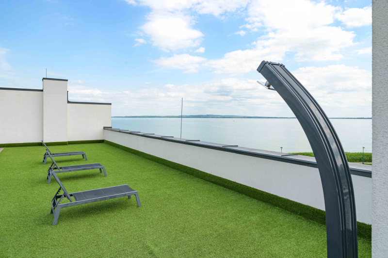 - Napozóterasz zuhanyzóval a tetőn, ahol gyönyörködhet a balatoni panorámában,