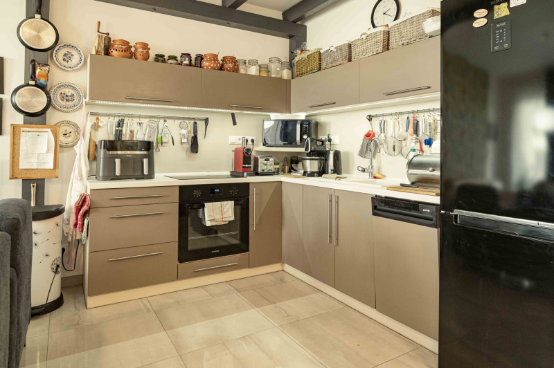 Modern konyhai gépek (hűtőszekrény, főzőlap, sütő, mikró), mosógép és szárítógép, 2 db TV, minőségi bútorzat minden helyiségben.