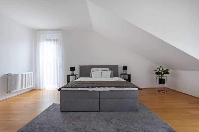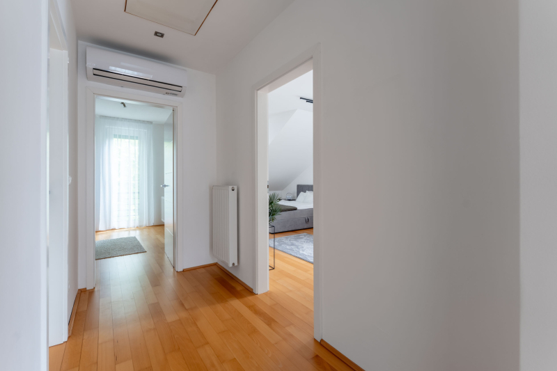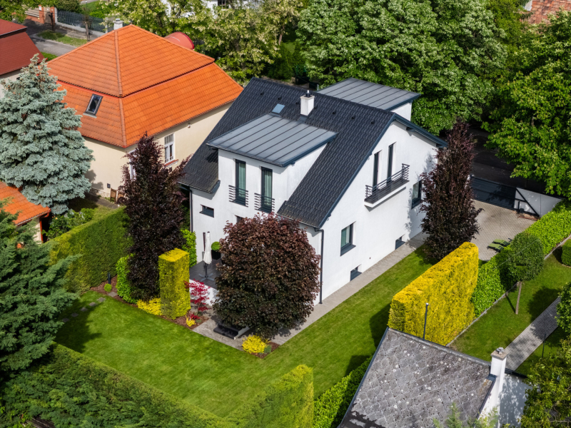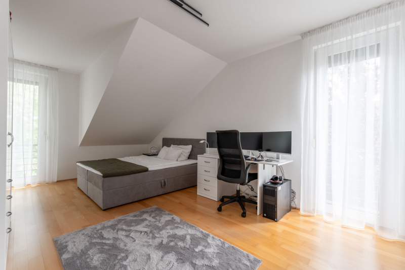 A felső szinten három további hálószoba és egy külön fürdőszoba található – ideális gyerekeknek, vendégeknek, vagy akár dolgozószobának. A helyiségekből zöldellő kertekre nyílik kilátás, a tágas ablakokon beáradó fény pedig a nap különböző szakában más-más hangulatot teremt. Itt valóban minden szoba saját élettérként működik.