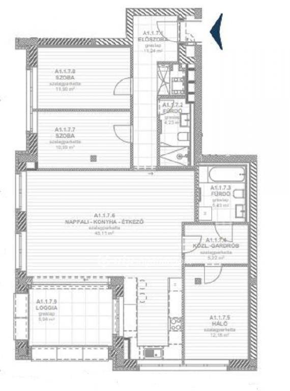 A lakás helyiségei: előszoba, szoba, amerikai konyhás nappali, szoba, félszoba, közlekedő - gardób,  fürdőszoba, fürdőszoba.