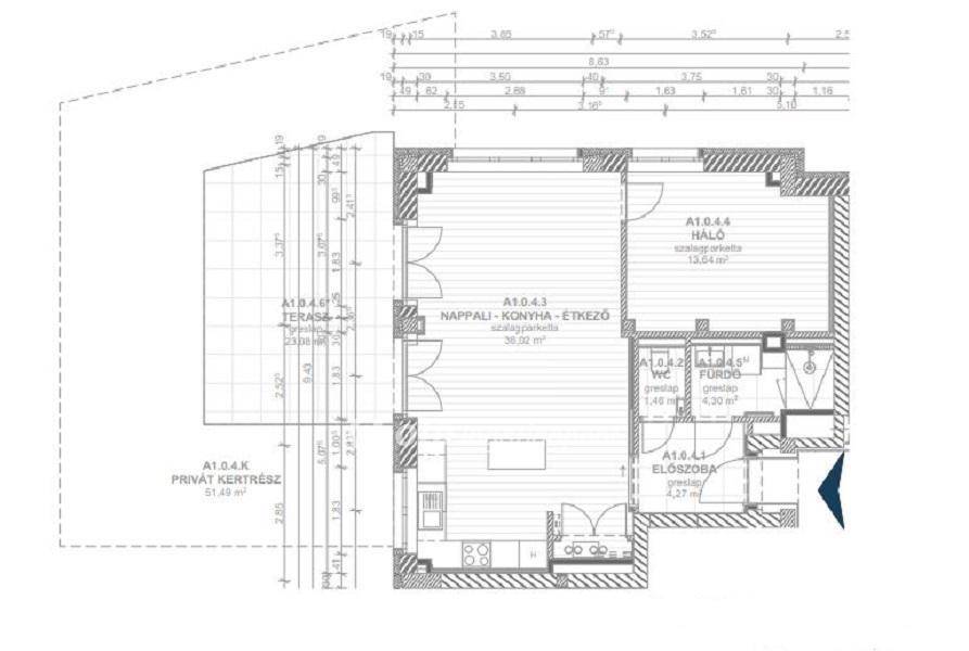 A hirdetésben szereplő lakás, az A épület földszintjén helyezkedik el, ÉNY tájolással, 59.69 m2 alapterülettel, mely életteret tovább növeli a 23.08 m2 alapterületű terasz és a 51.49 m2 területű privát kert. A lakás helyiségei: előszoba, WC, szoba, amerikai konyhás nappali, fürdőszoba.