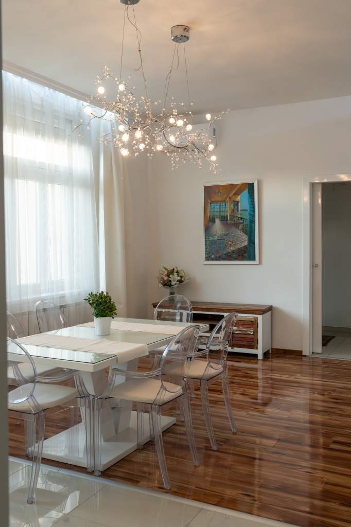 A legmodernebb anyagok és egyedi design jellemzi a lakást, ahol a magasfényű modern bútorok és vintage stílus tökéletes harmóniát alkotnak.
