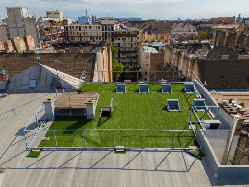 A tető új szigetelést kapott illetve műfüvesítve lett.